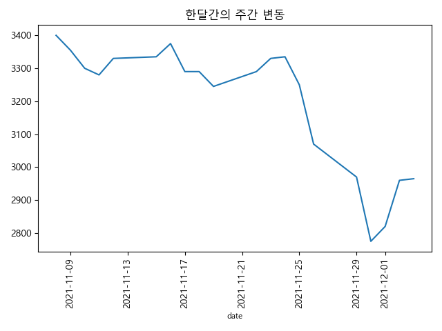 한화생명(088350)의 1개월 동안의 주간 변화를 살펴보겠습니다. 1개월간의 최저값는 2775이며, 최고값은 3400입니다. 1개월간의 상승률은 -12.79입니다.